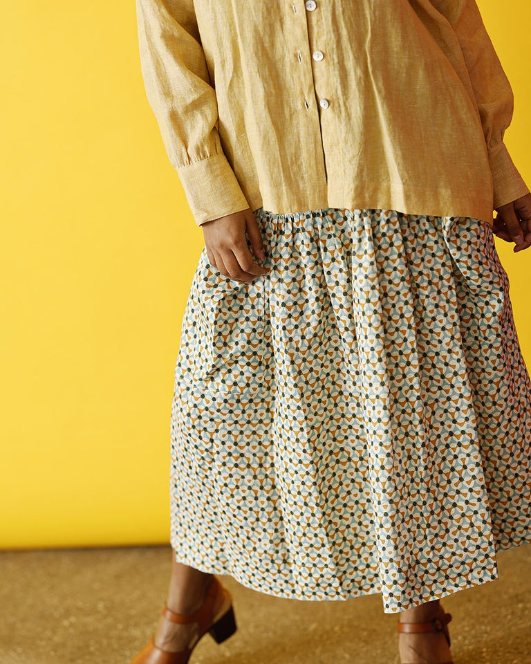 - Linskjørt med print, turkis/karrigul.