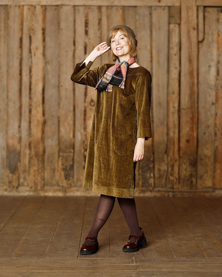- Kjole i kordfløyel, gyllen.