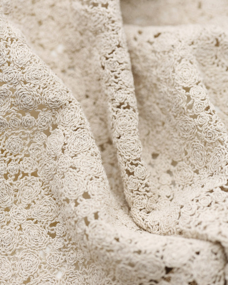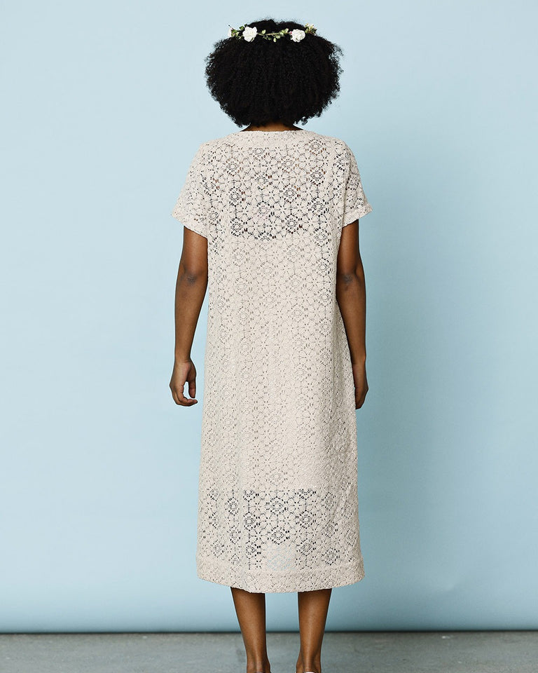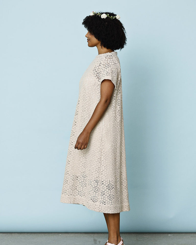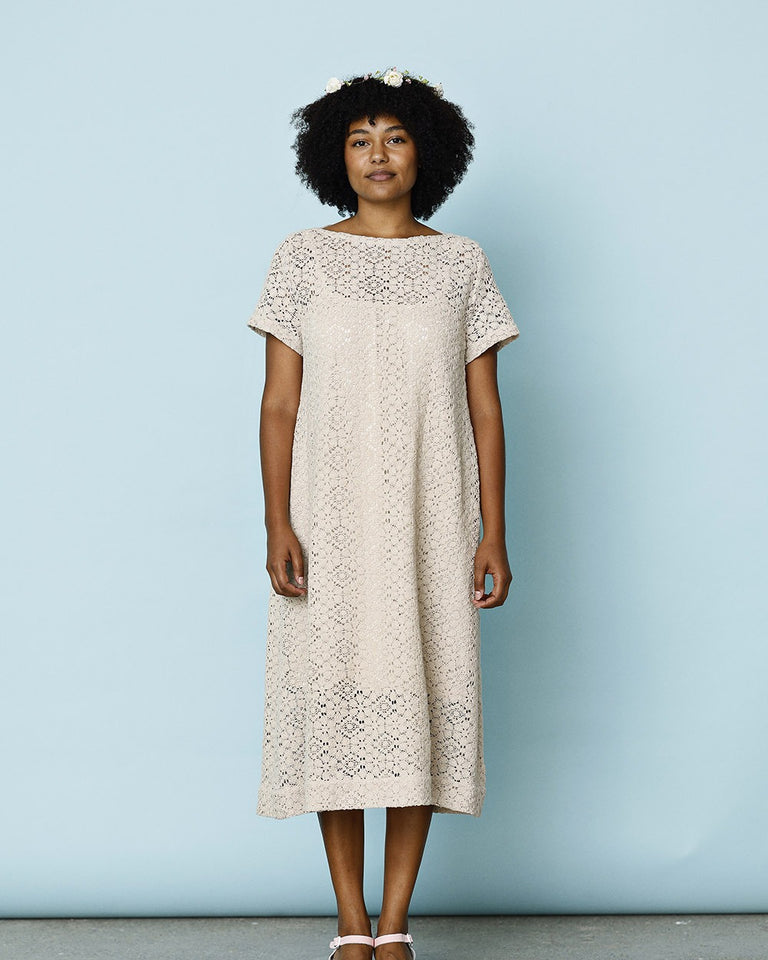 Sommerkjole sydd i et fint stykke stoff med grafiske blomsterformasjoner. Stoffet gir noen blonde assosiasjoner, men er egentlig mer en moderne versjon av en heklet bestemorduk.