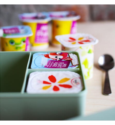 Matboks i plast med tre rom og motiv av tre bjørner på lokket. Det er plass til en liten yoghurt i hver av de to små rommene.