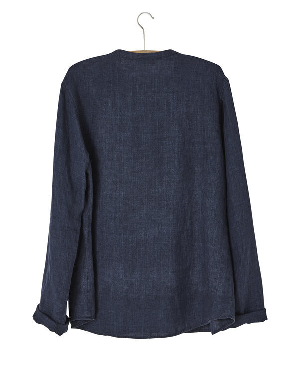 En alle tiders favorittskjorte i tynn lin med små biser foran. Rund hals med bestefarkrage og knepping halvveis ned foran. Hellange ermer og en lett buet fald. Normal passform.