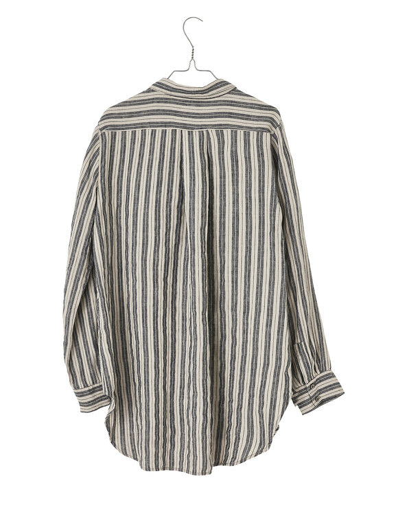 Klassisk herre-inspirert skjorte i stripete tynn lin med sjenerøs lengde og buet kant nederst. Krage og knepping foran. Bærestykke bak med boksfold, hellange ermer med mansjetter. Normal passform.