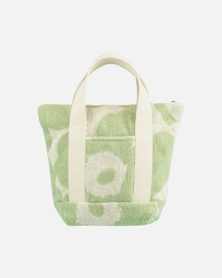 The Terry Spa Bag is made of organic cotton terry. The bag has two handles, a zipper closure, and a small outside pocket. The recycled polyester Marimekko label is sewn in the front.