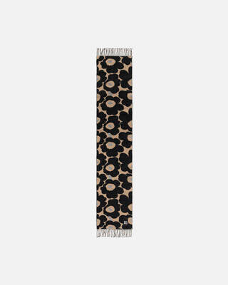 The Savut scarf is made of a wool blend in the Unikko pattern. The long scarf has fringes at the ends and it features the Marimekko label.
