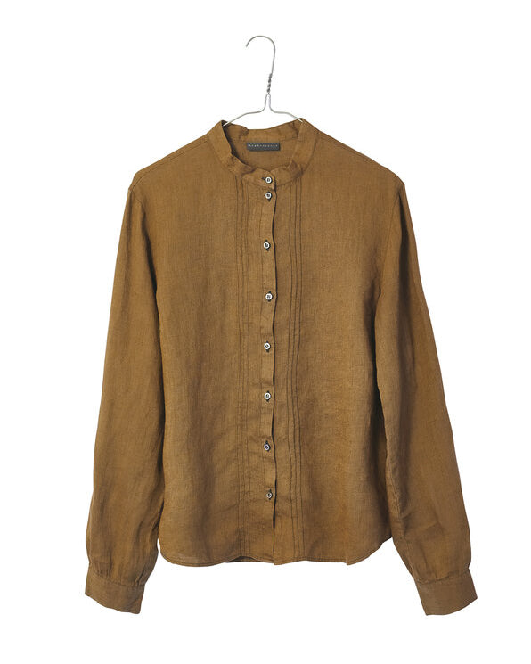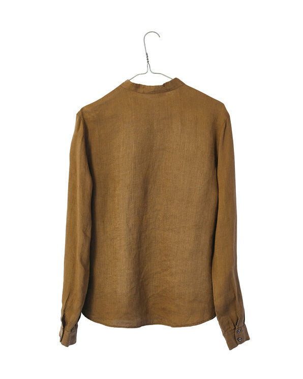 Skjorte uten krage i lin med dekorative biser foran. Skjorten er litt lengre bak enn foran.