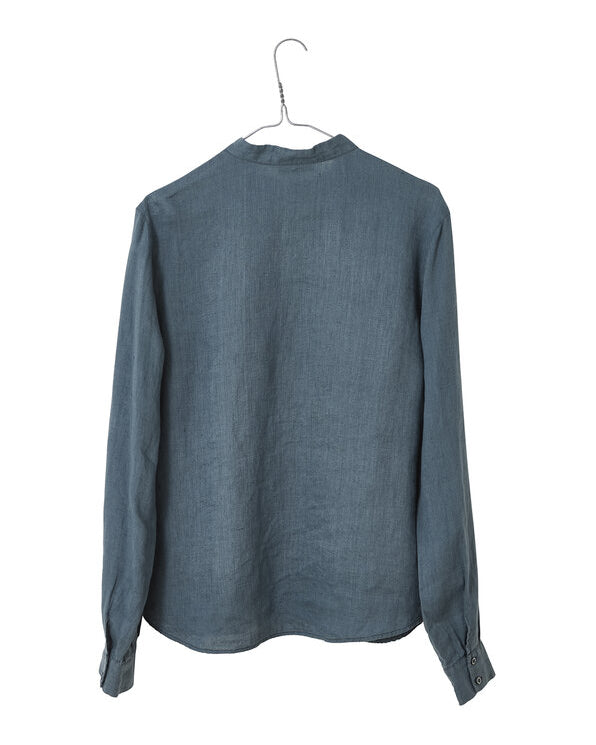 Skjorte uten krage i lin med dekorative biser foran. Skjorten er litt lengre bak enn foran.