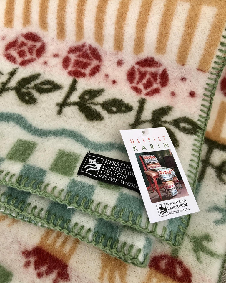 Ullteppet KARIN er en hyllest til Karin Larssons design og tekstiler i hjemmet i Sundborn. Broderte puter og duker, stoffer og interiørets fargelegging har inspirert de ulike mønstrede kantene.