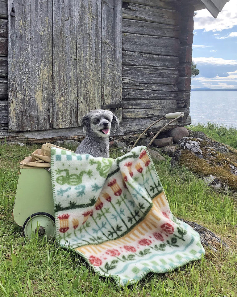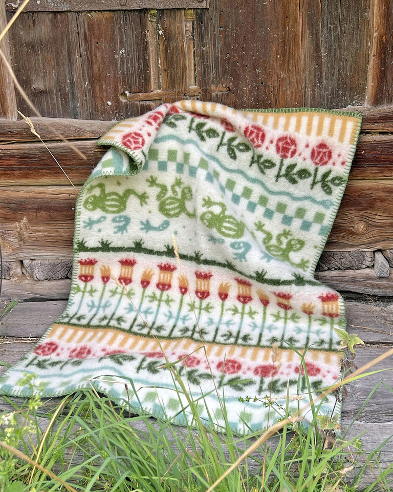 Babypleddet Esbjörn er samme som KARIN er en hyllest til Karin Larssons design og tekstiler i hjemmet i Sundborn. Broderte puter og duker, stoffer og interiørets fargelegging har inspirert de ulike mønstrede kantene.