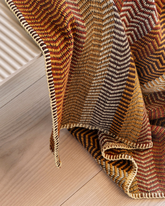 Fri pledd og puter er inspirert av de tradisjonelle løperne man finner variasjoner av rundt om i nesten hver fjellhytte i Norge. I denne nye tolkningen er den typiske repeterende fargerytmen noe oppløst og fargene skifter i en randomisert, myk og slyngende sikksakk.