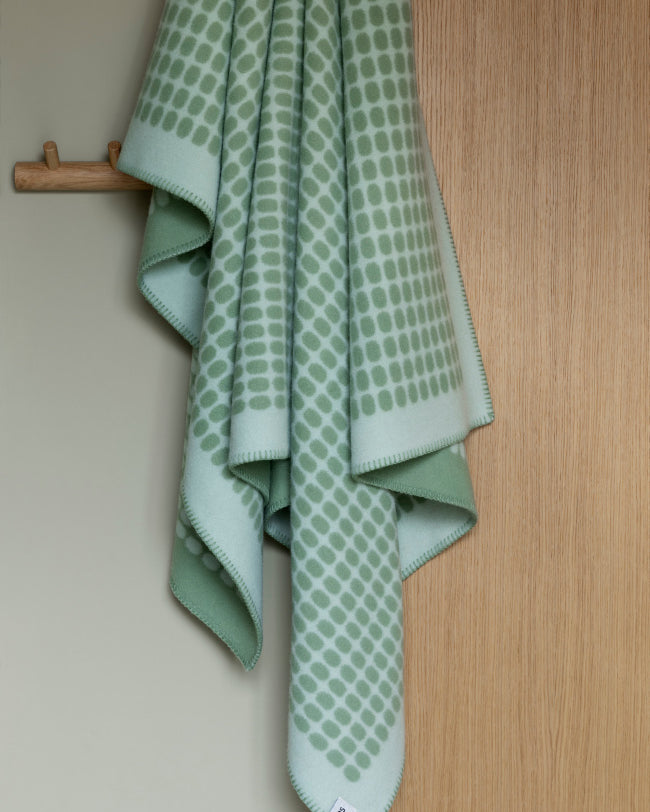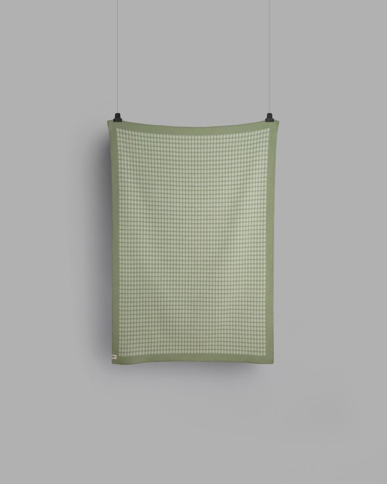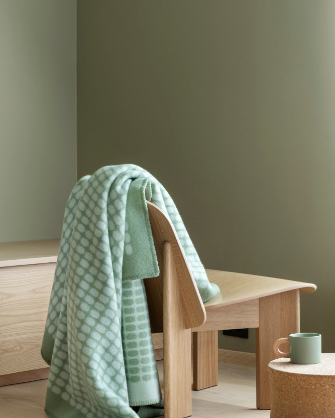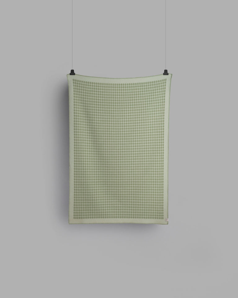 Selv om mønsteret er vevd inn i pleddet, kan det nesten se ut som det er trykket på den myke overflaten og gir assosiasjoner til klassiske teknikker som sjablong, silketrykk, litografi, raster og blokktrykk