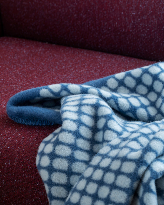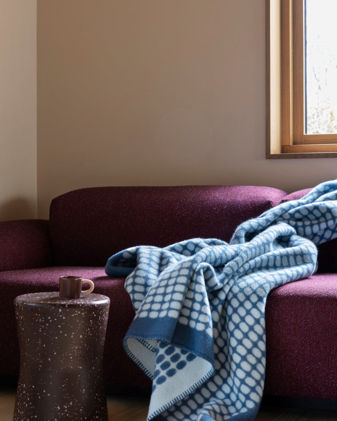 Selv om mønsteret er vevd inn i pleddet, kan det nesten se ut som det er trykket på den myke overflaten og gir assosiasjoner til klassiske teknikker som sjablong, silketrykk, litografi, raster og blokktrykk