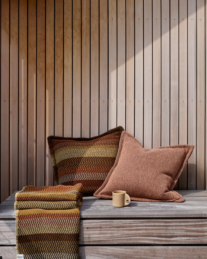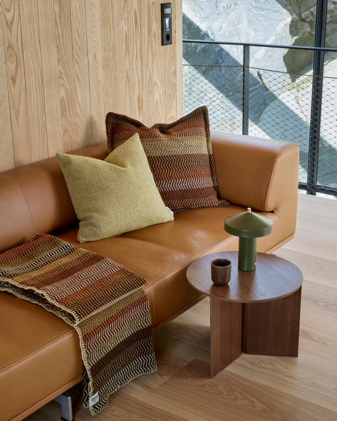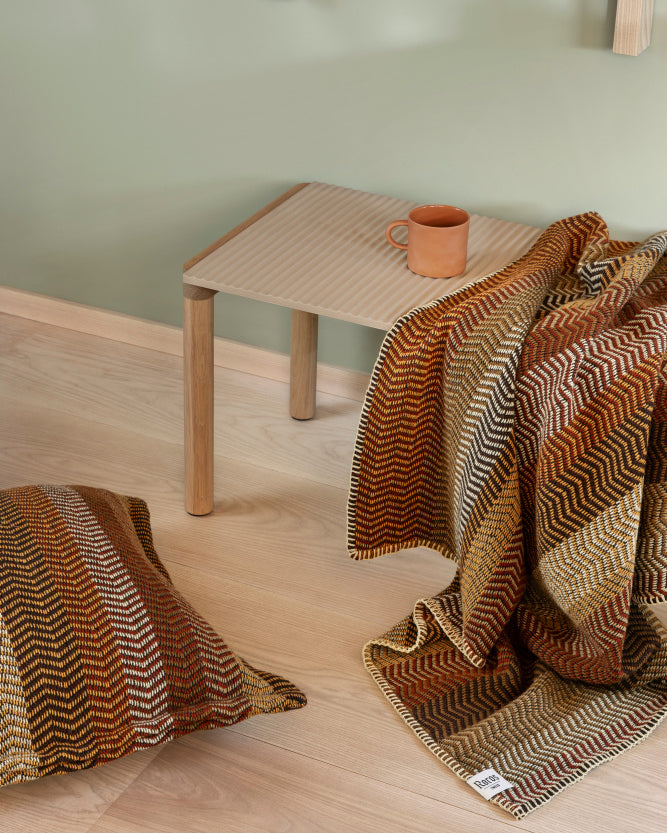 Fri pledd og puter er inspirert av de tradisjonelle løperne man finner variasjoner av rundt om i nesten hver fjellhytte i Norge. I denne nye tolkningen er den typiske repeterende fargerytmen noe oppløst og fargene skifter i en randomisert, myk og slyngende sikksakk.
