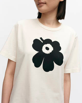 Erna II t-skjorten er laget av bomullsjersey med en stor Unikko (Valmue) foran. Den har en rund hals, et rett snitt og unisex-design og størrelse.