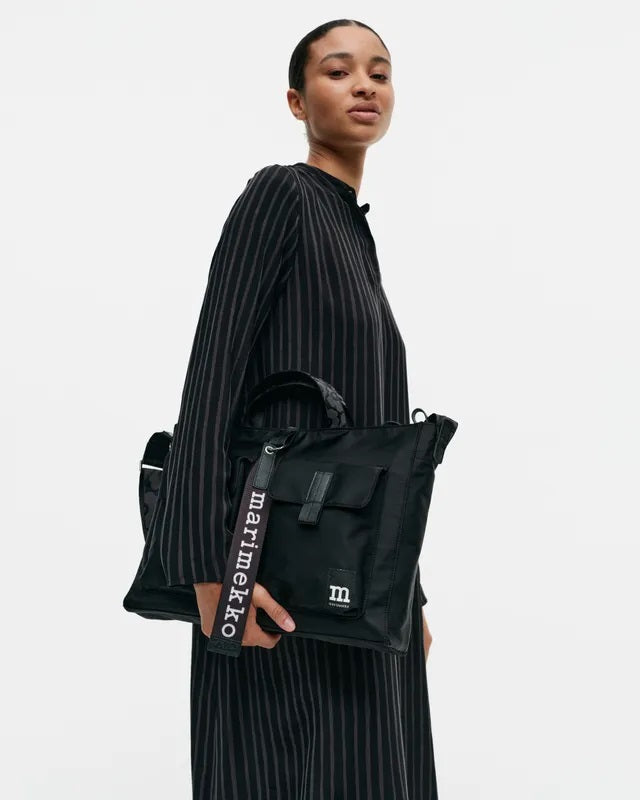 Vesken lukkes med glidelås, og den har håndtak samt justerbar skulderrem med jacquardstrikket Unikko-mønster. Innsiden har et romslig hovedrom og en stor laptoplomme med borrelås og en liten innklipslomme. Det er en Marimekko nøkkelring og to klafflommer med magnetisk knappelukking i front. Vesken har skinndetaljer.