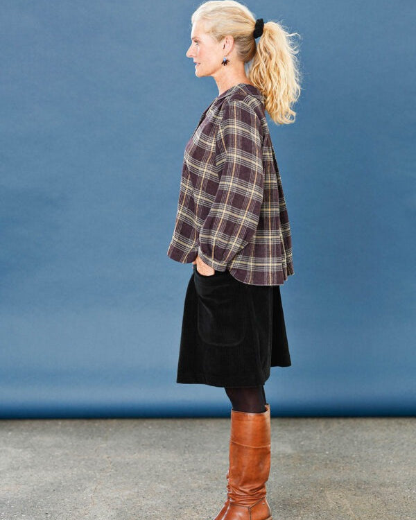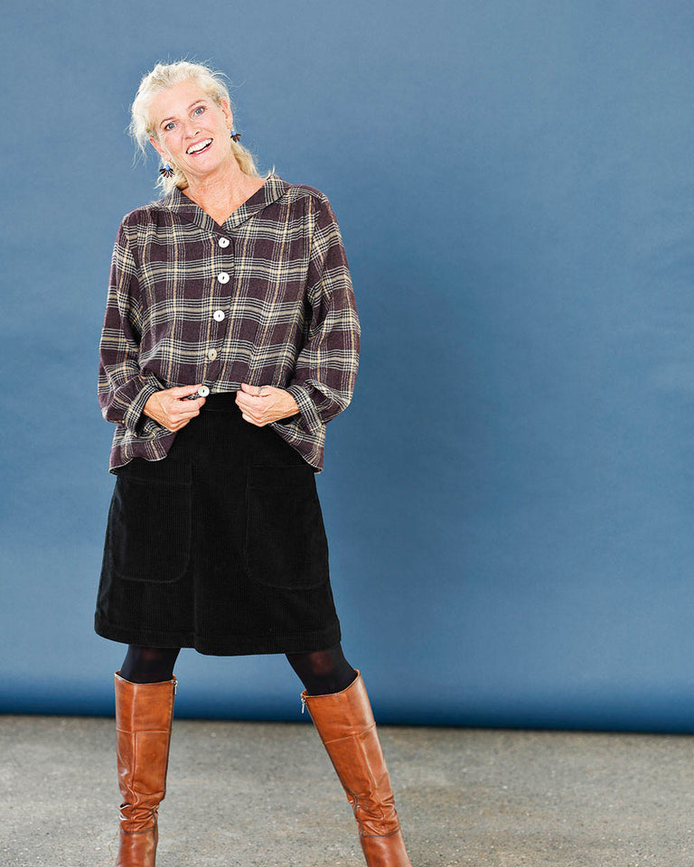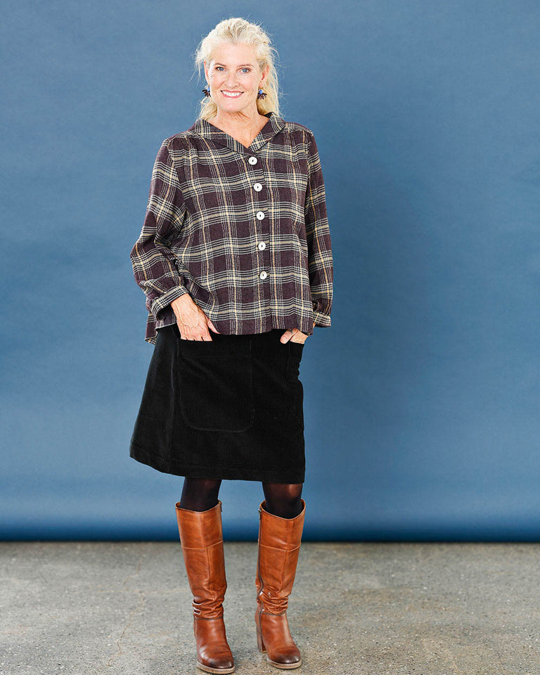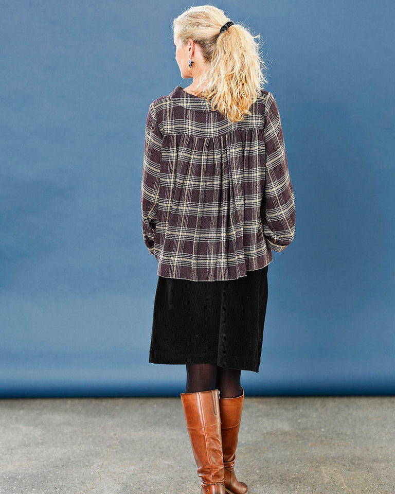 Blusen kan kneppes helt ned og har en kledelig sjalkrage. Den har lange ermer med litt rynker nederst.