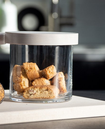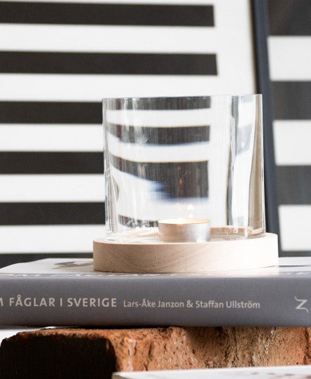 Størrelse: Glassylinderen er 11cm i diameter og 11cm høy, tretønnen/lokket er 13cm i diameter og 2cm høy.