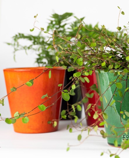 Blomsterpotte i glasert leirgods, glasert inn- og utside, relieffstempel "rotor" på utsiden i bunn.