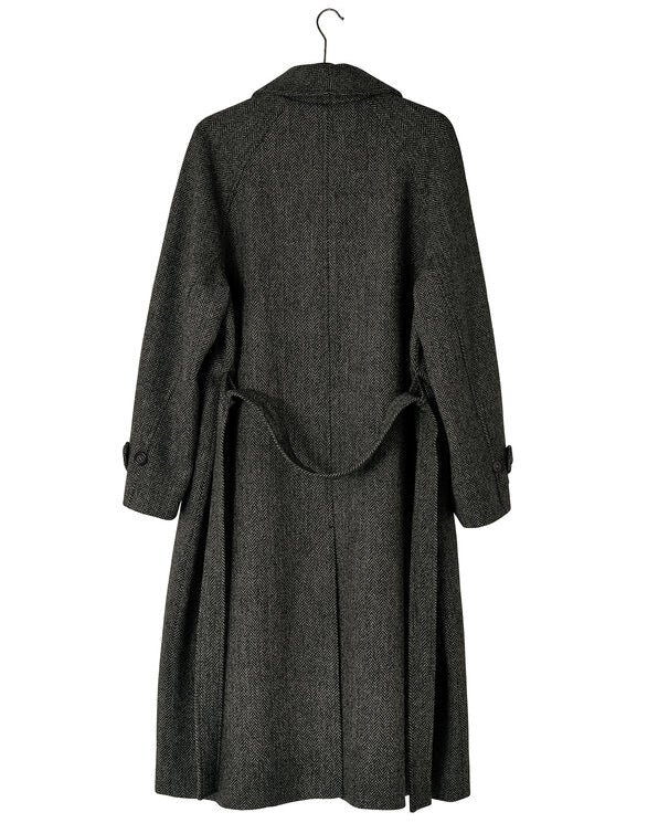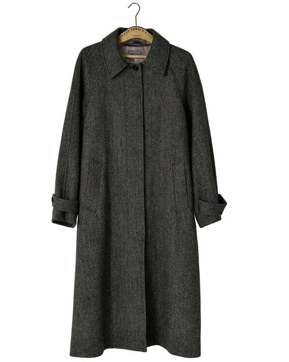 Raglankåpe i håndvevd Harris Tweed. Skjult knepping foran med den øverste knappen vist. Klassisk flat krage og vide ermer med stropper ved mansjettkanten. Skrålommer, splitt bak og avtakbart belte. Helfôret med acetat sateng fôr. Bred sjenerøs passform. Den unikt nummererte historiske Orb-etiketten inne i plagget garanterer "tweed av høyeste kvalitet, farget, spunnet og håndvevd av øyboere i de ytre Hebridene i Skottland"