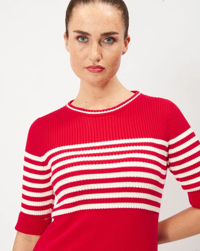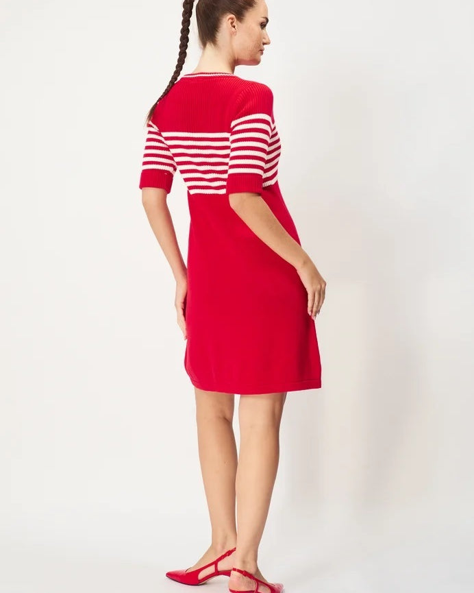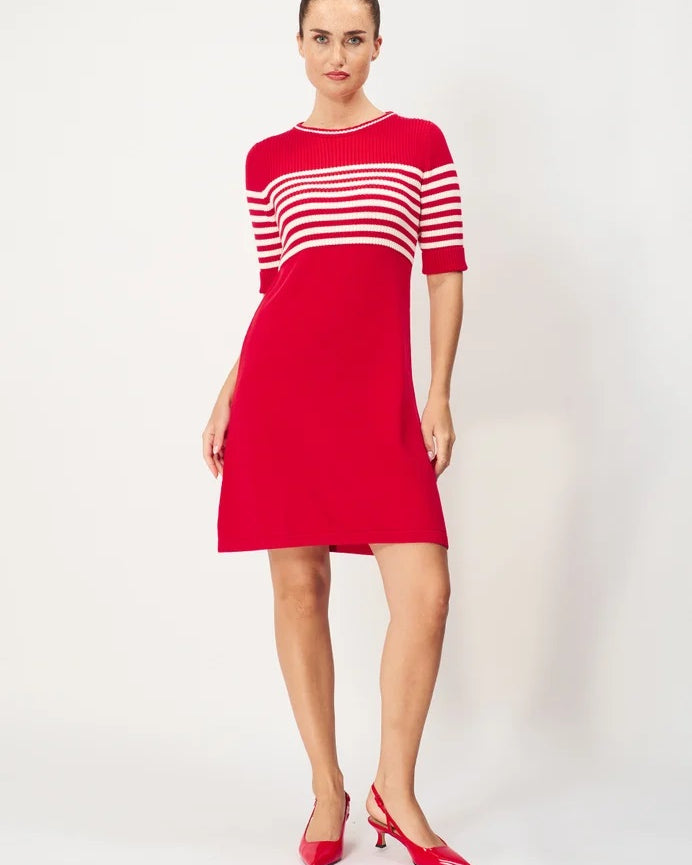 Carla er en nydelig knelang kjole i 100% bomull. Dekorstriper øverst og ermene avsluttes før armfolden. En behagelig hverdagskjole med fin figur.