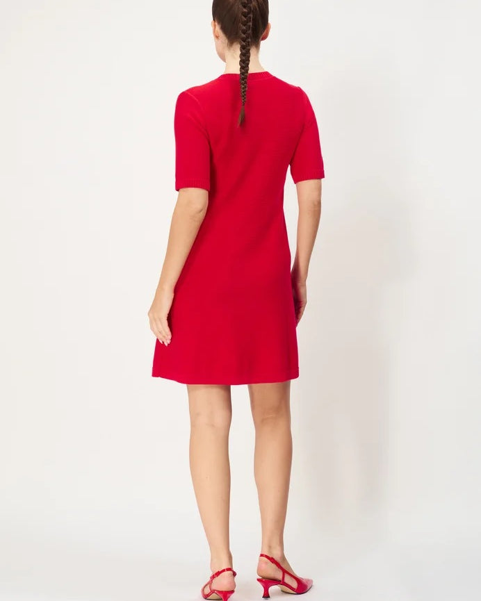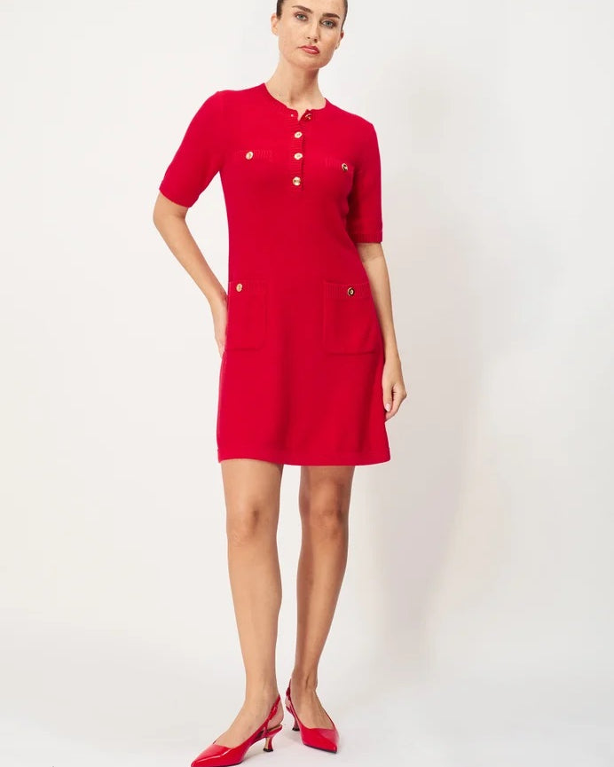 Roxanne er en klassisk kjole i myk bomull med ærmer som slutter rett over albuen. Kjolen er i litt grovere strikk med lommer på brystet og fire knapper opp mot kragen. Skjørtet slutter over kneet.