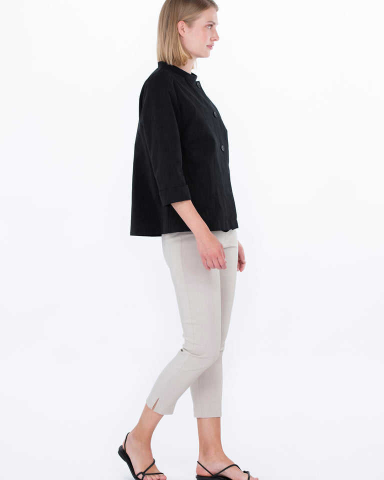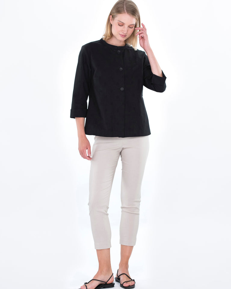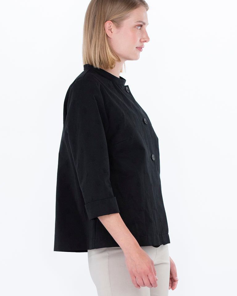 Den sorte PIONI-jakken passer både til hverdags og til mer formelle anledninger. Jakken er laget av jacquard-stoff i bomull med et mønster av små prikker. Den ufôrede jakken har en liten ståkrage og knappelukking. Det er små spalter på mansjettene og ermene kan brettes for å gjøre dem kortere. Den rettlinjede jakken blusser litt mot falden.