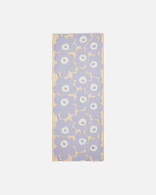 The sheer Fiore scarf is made of certified wool in the Unikko pattern. The ends of the scarf are unfinished.