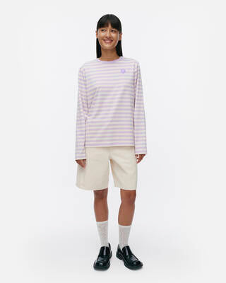 Tasaraita langermet t-skjorte er laget av bomullsjersey. Den langermede toppen er dekorert med tasaraita-mønsteret og en liten Unikko-blomst. Den har ribbestrikket rund hals. T-skjorten har en litt løs, avslappet fasong.