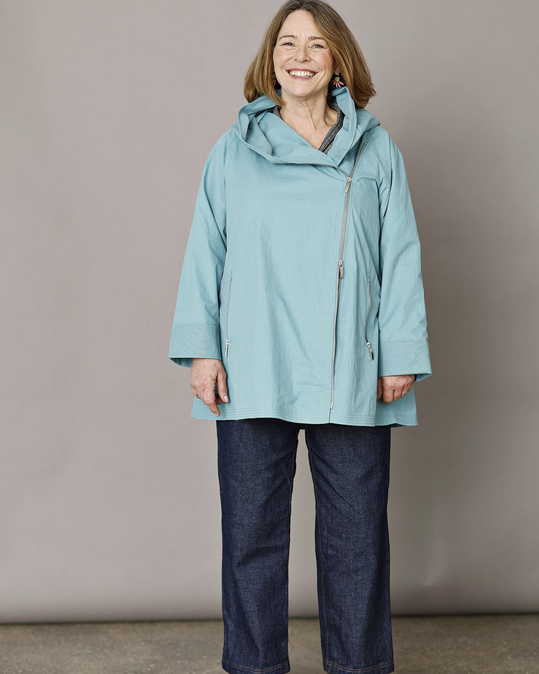 Jakke med asymmetrisk glidelås og hette. Lommer med glidelås i sidene.