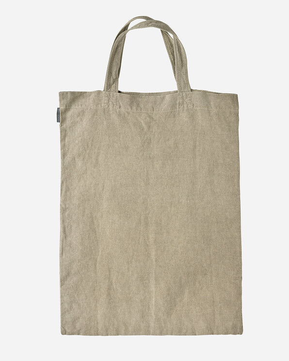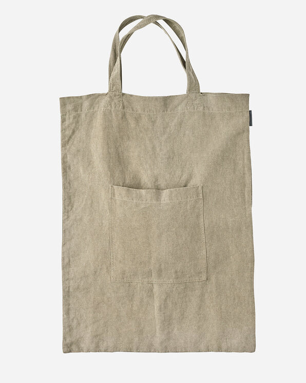 Stor veske i dobbel lin med lappet lomme foran og to stropper. Den perfekte vesken å ha med på tur. Pakk den flatt i kofferten og bruk den når kofferten ikke er stor nok til å ta med hjem "alt du trenger".