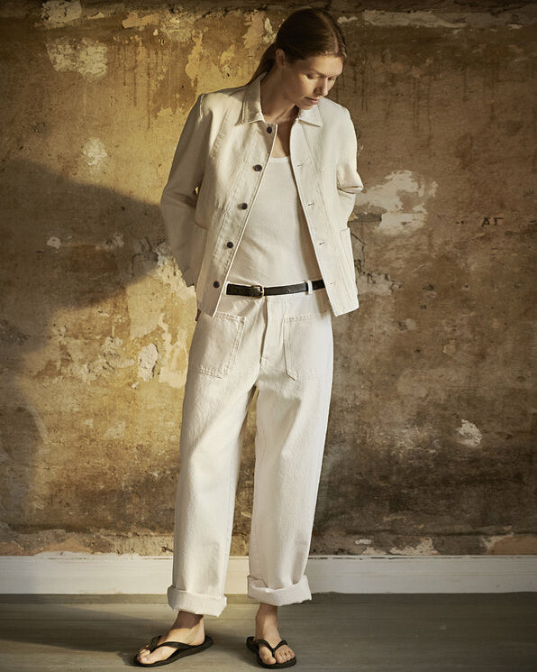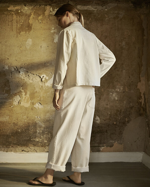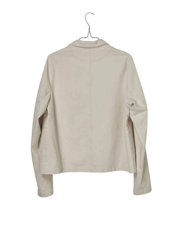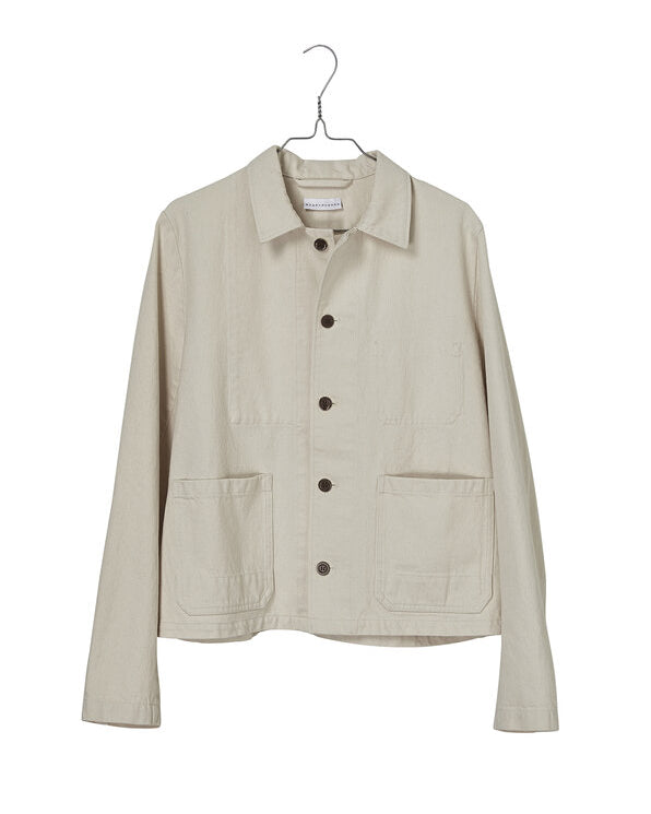 Arbeidsjakke i økologisk bomullstwill inspirert av vintage arbeidsklær. Flat krage, resirkulerte plastknapper, to påsydde lommer foran og en innerlomme. Hellange ermer med mansjetter. Avslappet passform.
