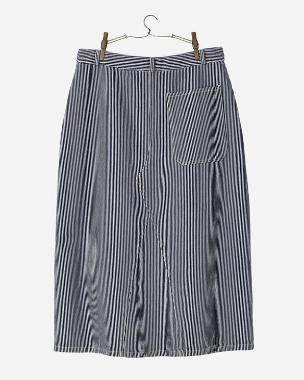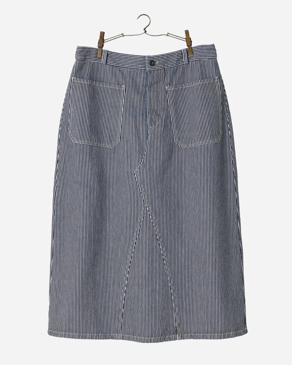 Arbeiderskjørt laget i denim med hickory striper. Knappelukking og to påsydde lommer foran og en påsydd baklomme. Inspirert av utseendet til arbeiderbuksene våre laget til et skjørt. Avslappet passform på hoften. Hvis du vil ha en mer klassisk passform, gå ned én størrelse.