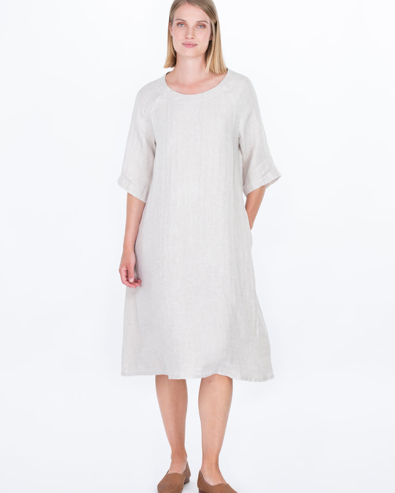 Den løstsittende lysbeige AUKIO-kjolen er laget av vakkert drapert lin, vevd i et fiskebeinsmønster. Den er forhåndsvasket, så den krymper ikke og føles behagelig mykt. Kjolen har rund hals, raglan-ermer som strekker seg over albuer og lommer. AUKIO kjole er designet i Finland og laget i Litauen.