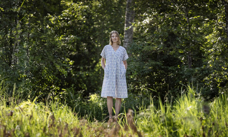 Den løstsittende PÄÄRYNÄ-kjolen er laget av vakkert drapert lin og bomullsstoff. Det grafiske Bambu-trykket i lyseblått og beige er designet av Erja Hirvi. Kjolen er forhåndsvasket, så den krymper ikke og føles behagelig myk. Den sommerlige kjolen har V-utringning og fold foran som gir rom. Den kortermede kjolen har lommer i sidesømmene. PÄÄRYNÄ kjole er designet i Finland og laget i Litauen.