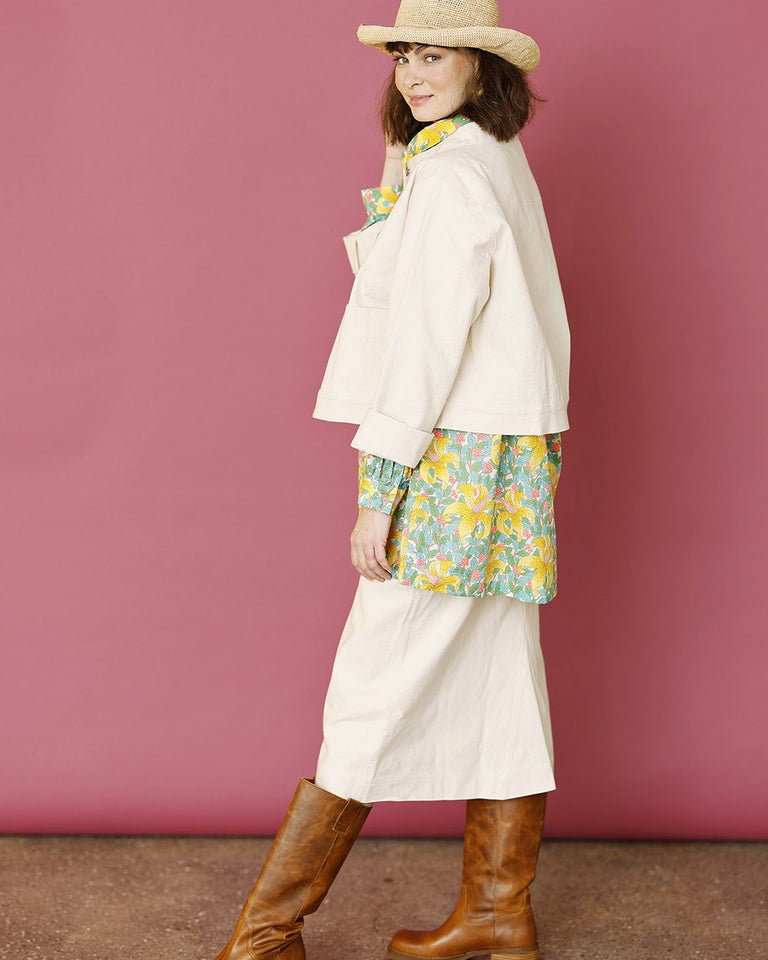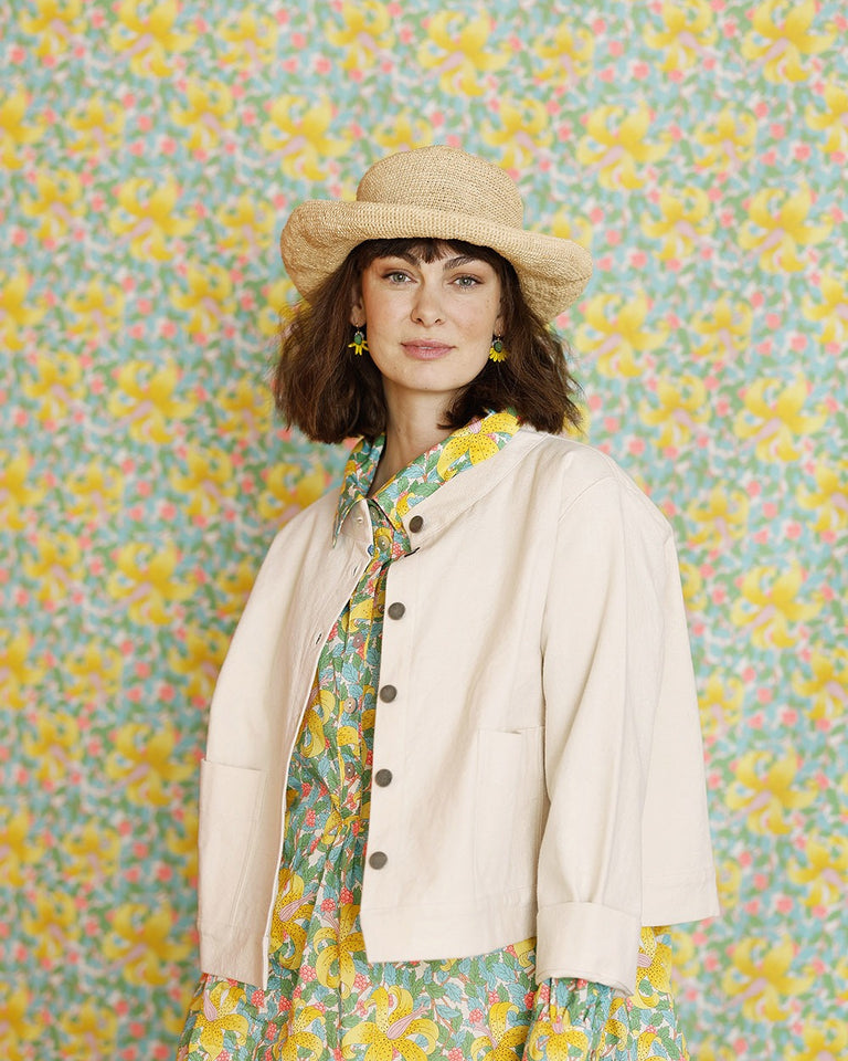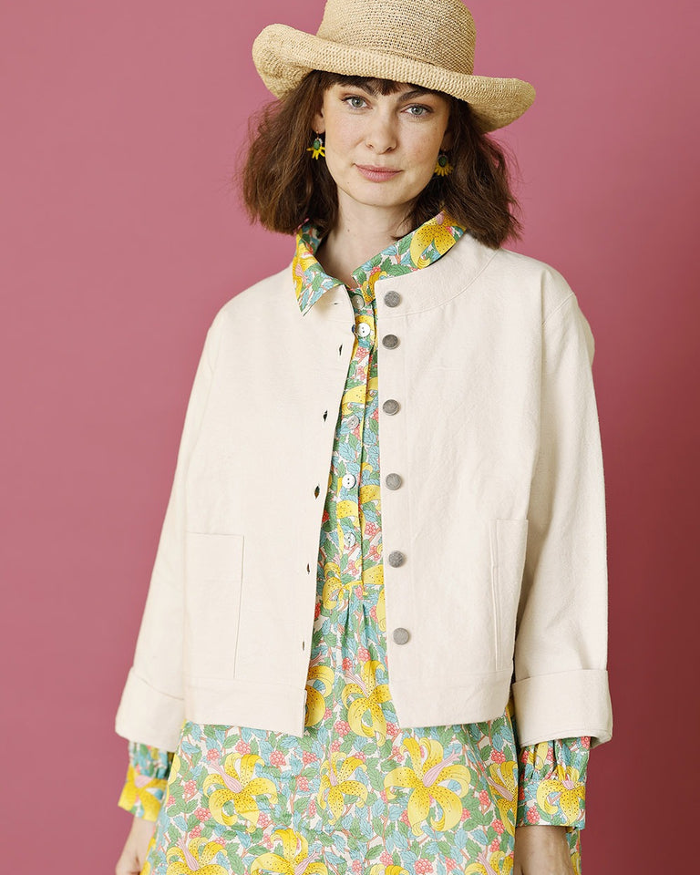 Den lille jakken har rund hals og to små lommer foran. Den korte, brede silhuetten gjør jakken egnet for også å ha over kjoler. Den er sydd i kraftig canvasbomull og er et alternativ til en liten cowboyjakke eller blazer. Jakken lukkes foran med dongeriknapper.