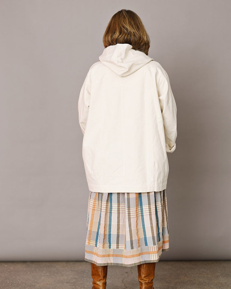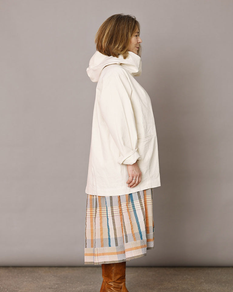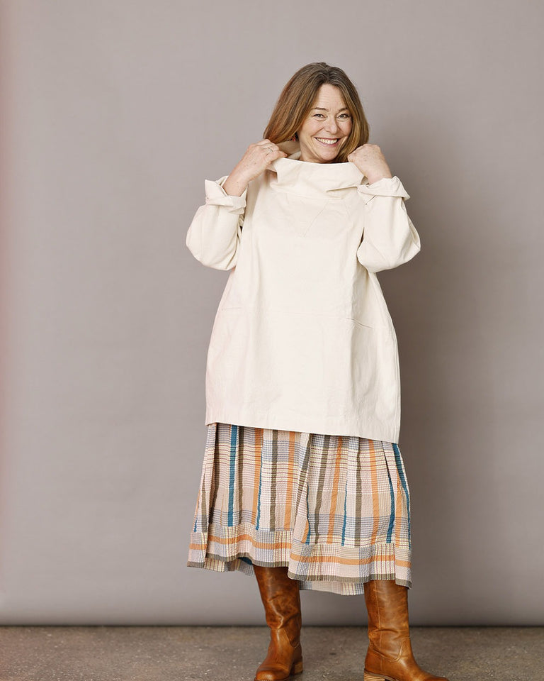 Anorakken har en oversized, vid og koselig silhuett og kan fungere som en slags sommergenser. Den kan også brukes som en tunika over et par slanke bukser. Plagget har hette som også gir den en koselig kragen samt to lommer i front.