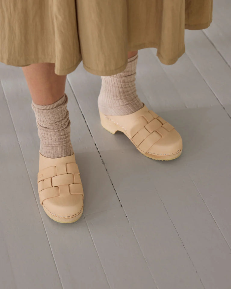 Näver Clog er laget av vegetabilsk garvet skinn og en vokset tresåle – naturlige materialer som eldes vakkert over tid. Læret er garvet med organiske ekstrakter, og naturlige merker og fargevariasjoner kan forekomme – en egenskap som bekrefter ektheten til våre materialer og håndverksproduksjon. Den flettede læroverdelen kan føles fast i begynnelsen, men vil myke og forme seg etter foten din med bruk.