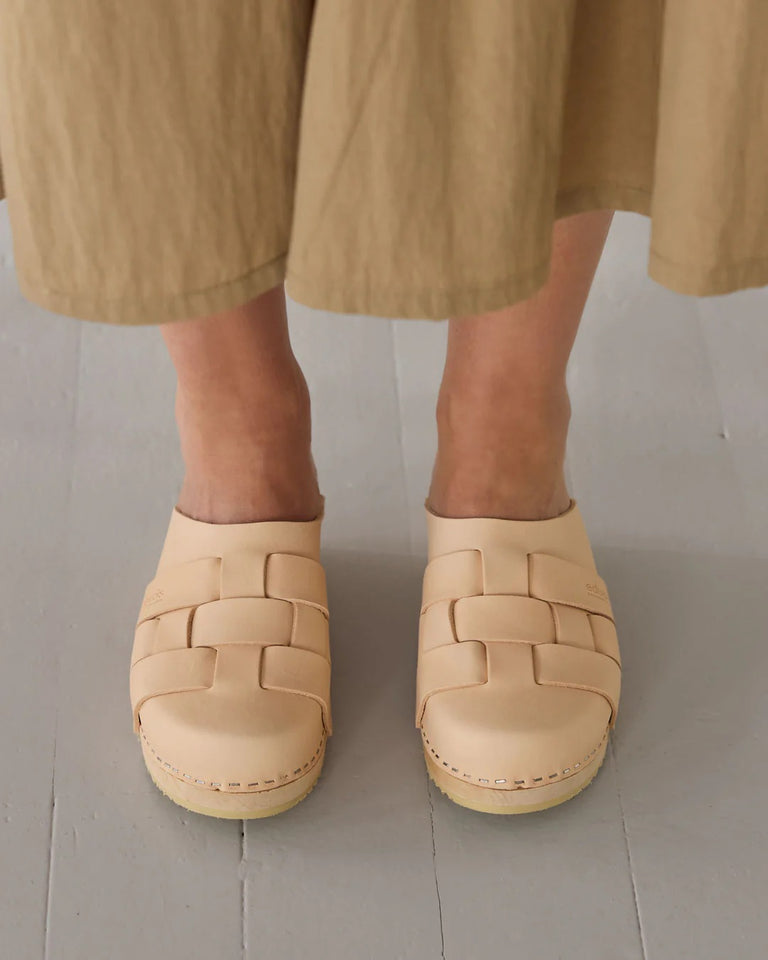Den lave treskoen er en klassisk modell med en sjenerøs passform, som gir god plass til foten og en behagelig følelse. Enkel å ha på og uanstrengt å style – fra avslappede sommerdager til denim og mer oppkledde looks. Den flettede skinnoverdelen, med brede stropper, gir skoen en distinkt karakter som knytter seg tilbake til signaturdesignet til Näver-kolleksjonen.