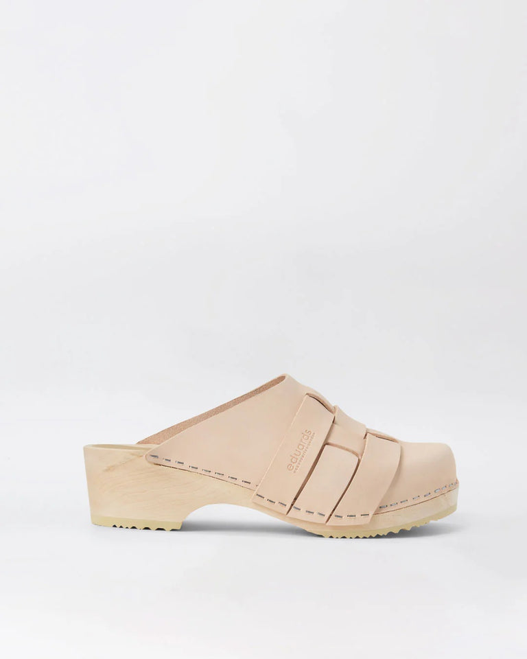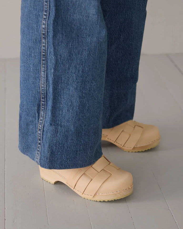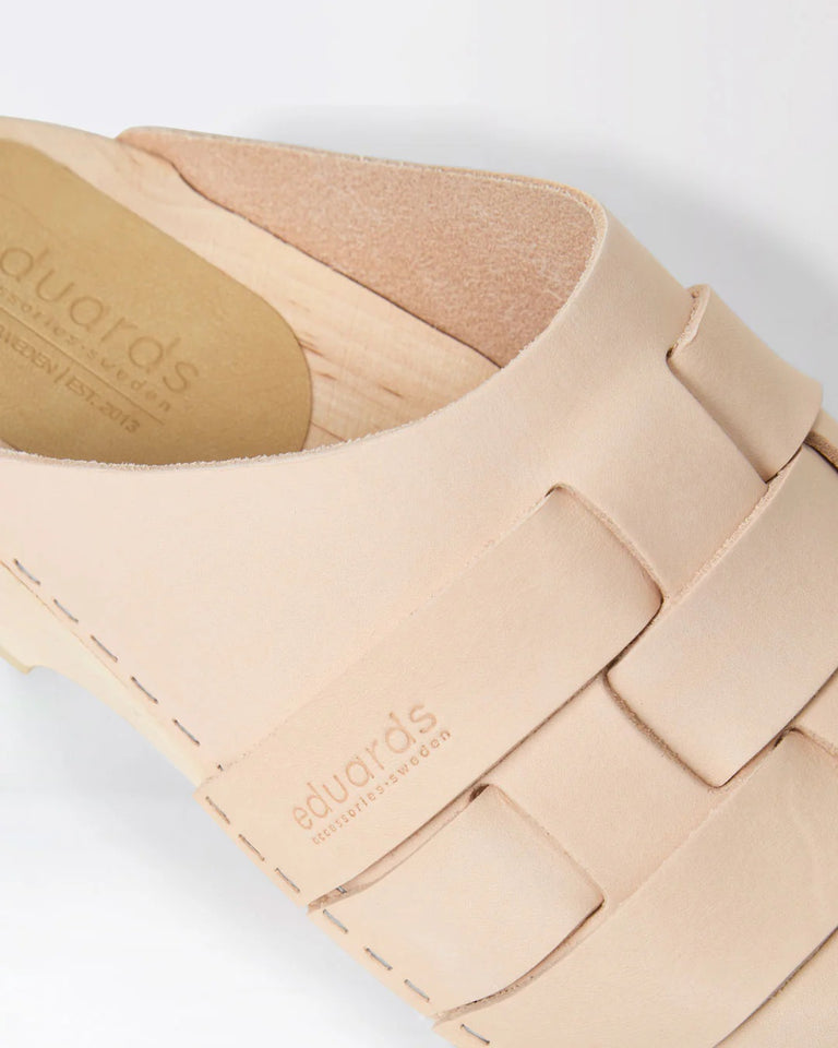 Näver Clog er Eduards moderne tolkning av den klassiske treskoen, der arkitektonisk design møter ekte håndverk. Med sin karakteristiske overdel i flettet skinn, inspirert av deres prisbelønte Näver-kolleksjon, omtolker den Eduards signaturdesign i en ny form.