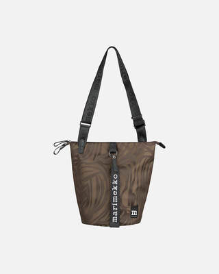 The All Day Bucket shoulder bag is made of recycled polyester with the jacquard knit Jokuraita pattern. The bag has three compartments: one with a zipper closure, one plain open compartment, and one open compartment with an inside pocket. The adjustable shoulder strap has the jacquard knit Marimekko logotext pattern.The front features the Marimekko keychain and there is a slip-in pocket in the back, which closes with a magnetic button.