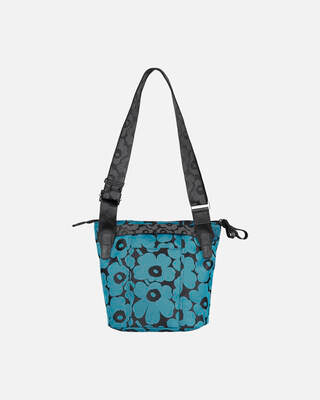 The Carry All Unikko shoulder bag has a zipper closure, a handle, and an adjustable, jacquard knit Unikko pattern shoulder strap. There is an open pocket on the inside and an open pocket on the outside. The Marimekko keychain is attached to the front.
