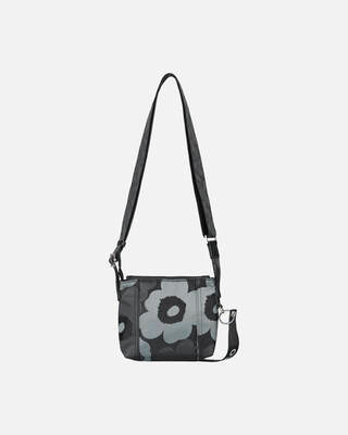 The bag has one open pocket and a larger open compartment under the front flap. The adjustable shoulder strap has the jacquard knit Unikko pattern. The bag features the Marimekko keychain and leather details.