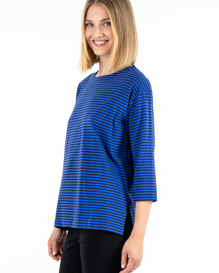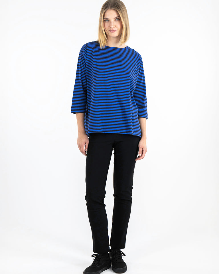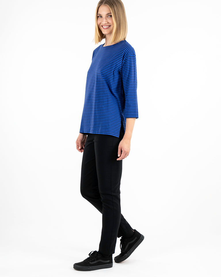 ULPUKKA genser har en rett fasong og er løstsittende. Materialet på den stripete toppen er myk bomullsjersey som føles behagelig mot huden. Den svarte og off-white stripete toppen har båthals, 3/4-lange ermer og splitt i sidesømmene.