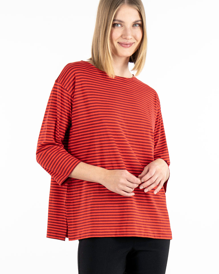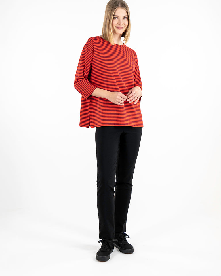 ULPUKKA genser har en rett fasong og er løstsittende. Materialet på den stripete toppen er myk bomullsjersey som føles behagelig mot huden. Den svarte og off-white stripete toppen har båthals, 3/4-lange ermer og splitt i sidesømmene.