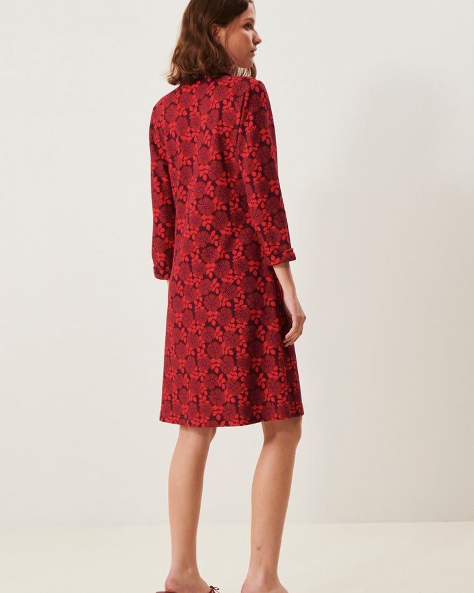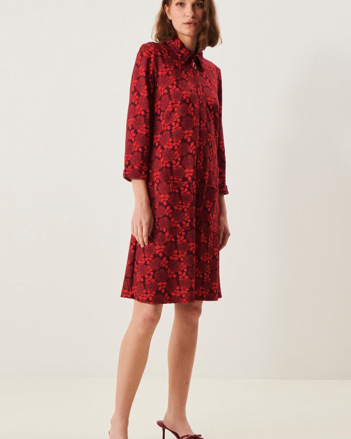 Lana er en vakker kjole med et nydelig retro-inspirert mønster. Høy, elegant krage og skjult glidelås foran. Synlige frontlommer. En herlig kjole med trekvart lange ermer som passer perfekt både til hverdags og spesielle anledninger. Den litt A-formede kjolen ender rett over kneet.