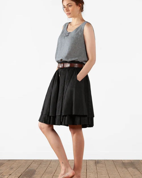 Videre vidde! Linskjørt med fin vidde og to lag med lykke. Lett plissert med underskjørt som går rett under kneet. Komfortabel strikk i midjen og lommer à la to. Pyntet med smale bånd i sidene og knapper foran.
