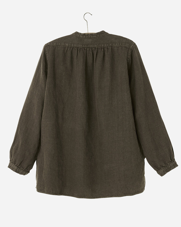 Bestefarskjorte i 100% lin. Rund hals med bestefarkrage og plissert bærestykke foran. Perlemor knepping foran og hellange ermer med mansjetter. Bakre åk med samlinger. Splitt i sidesømmene og rett nederkant med lengre rygg.