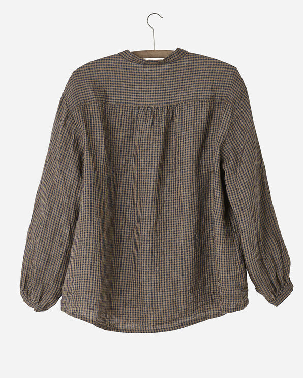 Vid bluse i myk, rutete kvalitet av 100% lin. Romslig vidde på både overkropp og ermer. Normal lengde og buet kant nederst. Krageløs og med perlemorsknapper foran. Bærestykke bak med rynker og små mansjetter.