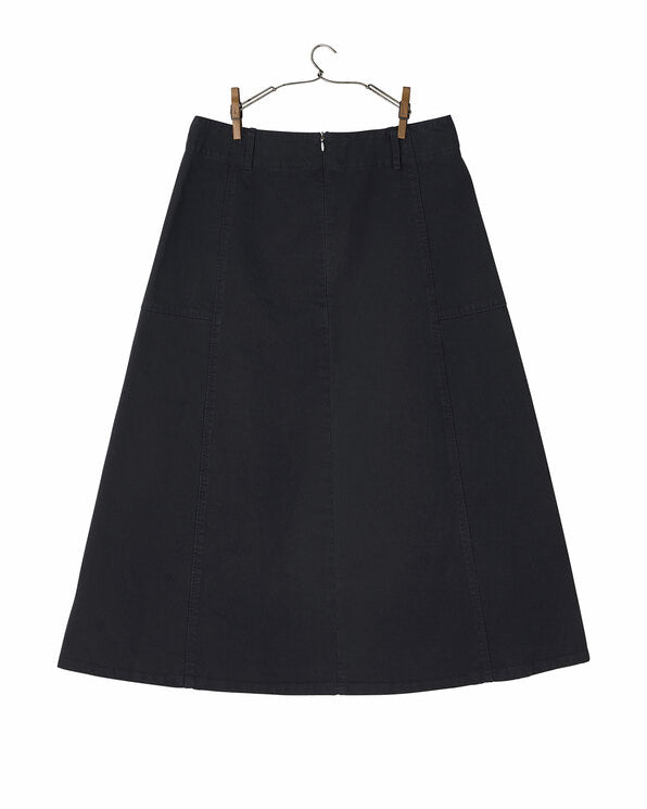 A-formet skjørt laget av økologisk bomull. Skjørtet har en praktisk kengurulomme og dekorative sømmer både foran og bak, noe som gir en ren silhuett et diskret preg. Ettersittende midje med beltehemper og skjult glidelås bak.