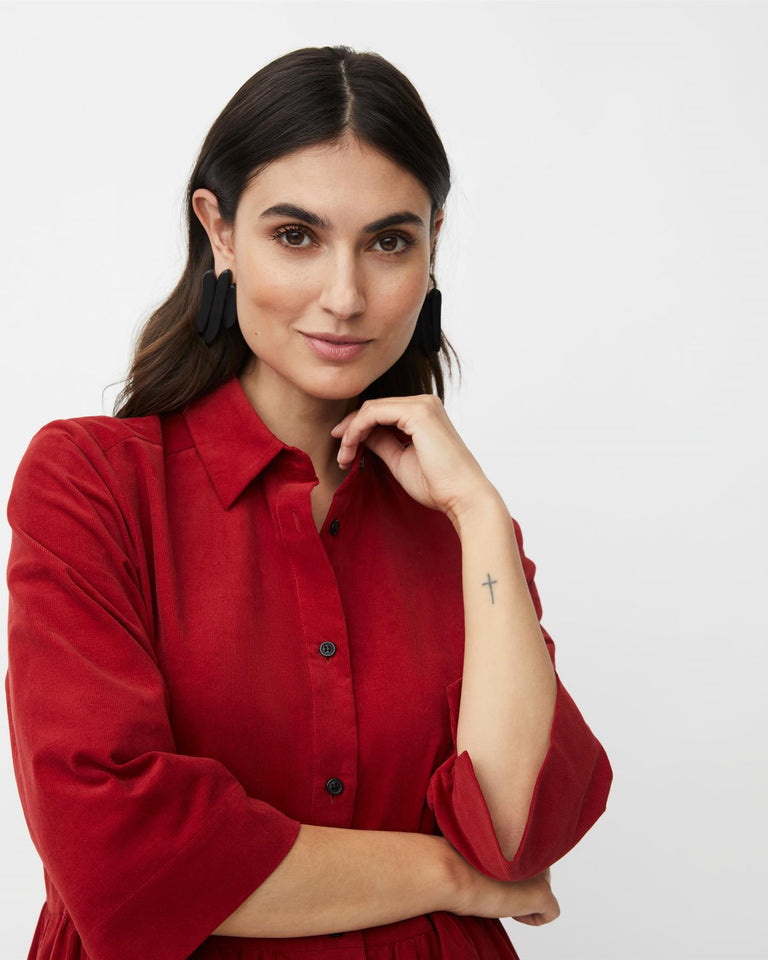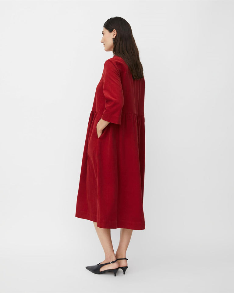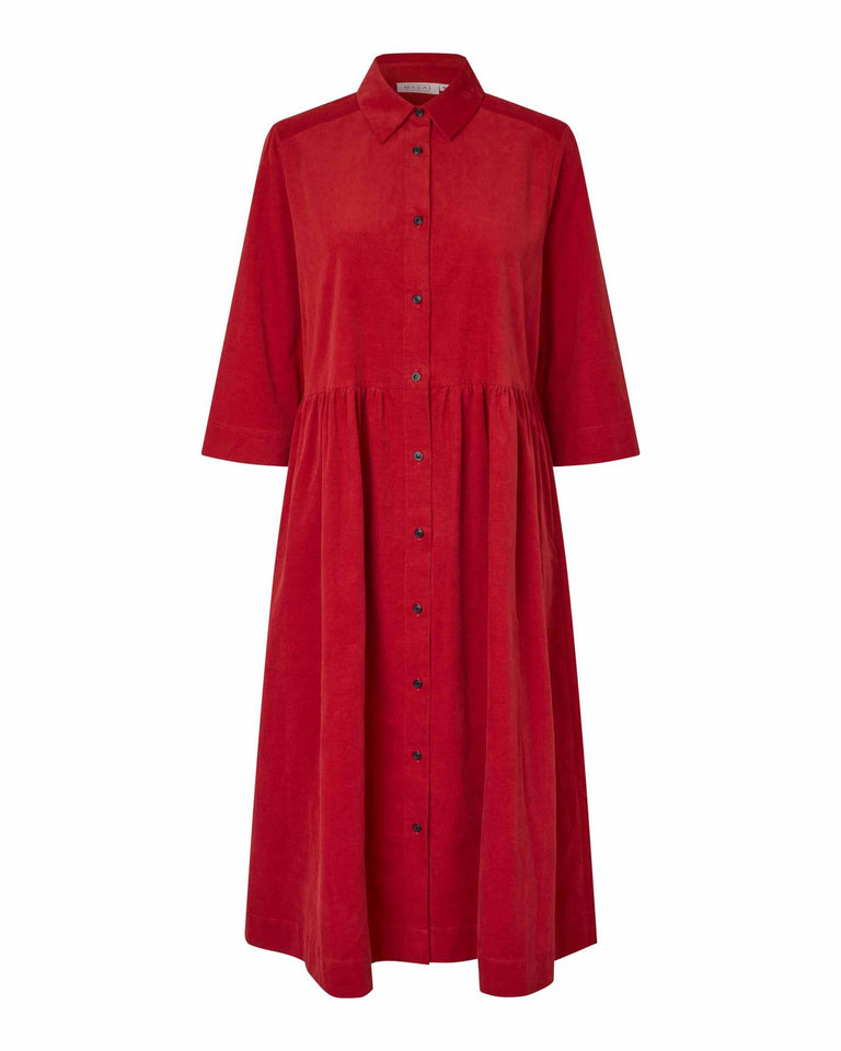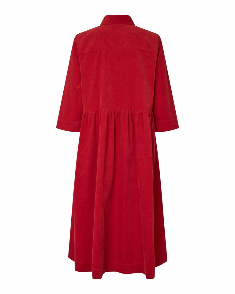 Denne ensfargede skjortekjolen er perfekt for dager hvor du vil holde det lett og stilrent. Den myke babyfløyelen gjør kjolen herlig å ha på seg, og med sitt A-formede snitt faller den mykt og komfortabelt på kroppen. Kjolen er designet med skjortekrage, sorte knapper, passepoilerte lommer og søm i midjen med små draperinger og et bølgete skjørt. Bruk den som kjole med leggings og høye boots, eller åpen som en jakke og la de lange linjene samle looken din.