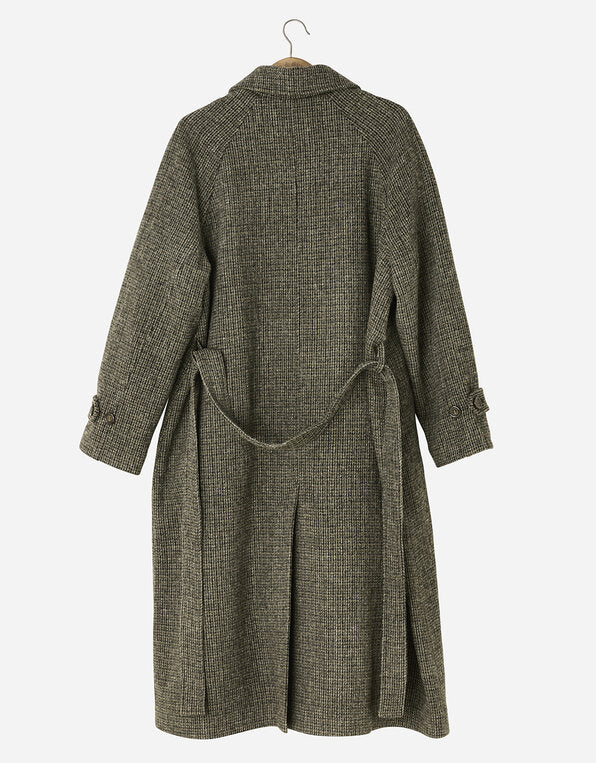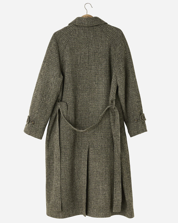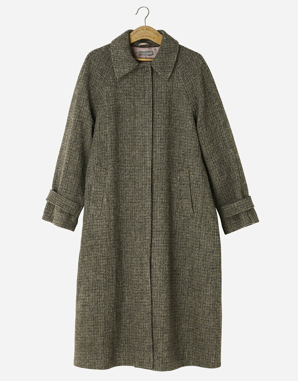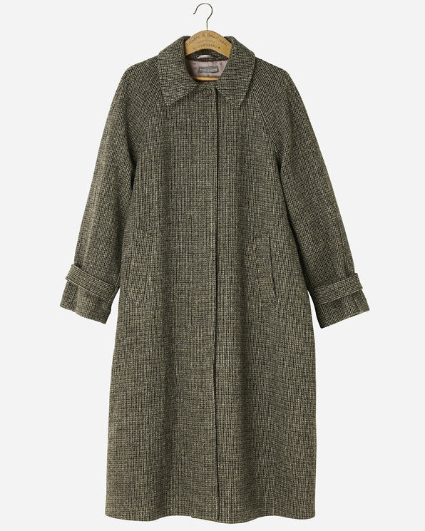 Raglankåpe i håndvevd Harris Tweed. Skjult knepping foran med den øverste knappen vist. Klassisk flat krage og vide ermer med stropper ved mansjettkanten. Skrålommer, splitt bak og avtakbart belte. Helfôret med acetat sateng fôr. Bred sjenerøs passform. Den unikt nummererte historiske Orb-etiketten inne i plagget garanterer "tweed av høyeste kvalitet, farget, spunnet og håndvevd av øyboere i de ytre Hebridene i Skottland"